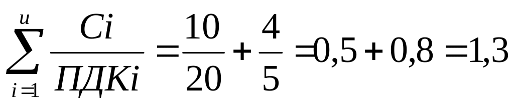 Таким образом, концентрация совокупности вредных веществ превышает ПДК в 1,3 раза. С учётом последнего, руководствуясь данными таблицы 1, видим, что по совокупности влияния углерода оксида и азота диоксида условия труда относятся к классу 3.1.