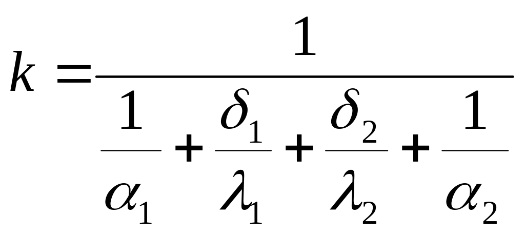 где α1 – коэффициент теплоотдачи от сжиженного газа к стенкам резервуара; δ1 и δ2 – соответственно толщина стенок резервуара и тепловой изоляции; λ1 и λ2 – соответственно коэффициенты теплопроводности материалов стенок резервуара и тепловой изоляции; α2 – коэффициент теплоотдачи от стенок резервуара к окружающей среде.