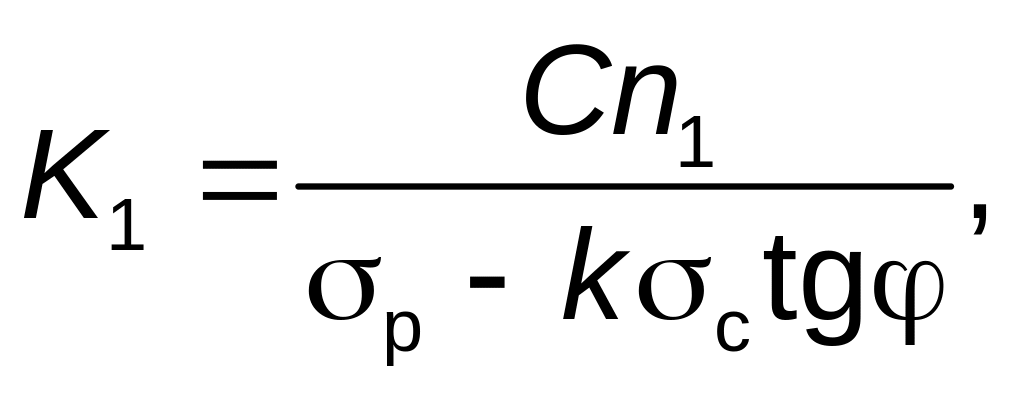В.4 Для оценки коэффициента запаса прочности по условию сдвигоустойчивости к пластическим деформациям определяют угол внутреннего трения , внутреннее сцепление С и определяют напряжения от расчетного автомобиля. В результате коэффициент запаса прочности по условию сдвигоустойчивости К1 определяют по формуле