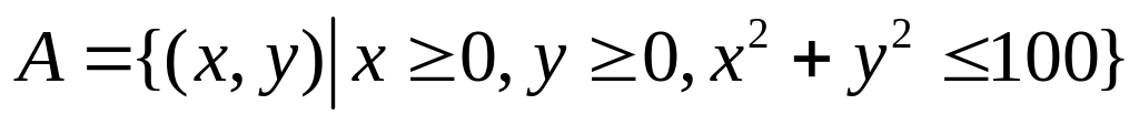 3. Эксперимент состоит в радиолокационном наблюдении воздушной цели. Наблюдаемый результат – положение светящегося пятна на экране индикатора цели, имеющего форму круга, радиуса 10 см. Опишем пространство элементарных исходов и следующие события: A={цель находится в первом квадранте}, B={цель находится в круге радиуса 5 см с центром в центре экрана}. Все интересующие нас события связаны с регистрацией положения светящегося пятна на экране. Удобной формой математического описания элементарного исхода являются координаты точки на плоскости в декартовой системе координат, связанной с центром экрана. Таким образом, пространство элементарных исходов бесконечно, непрерывно и может быть записано в виде: