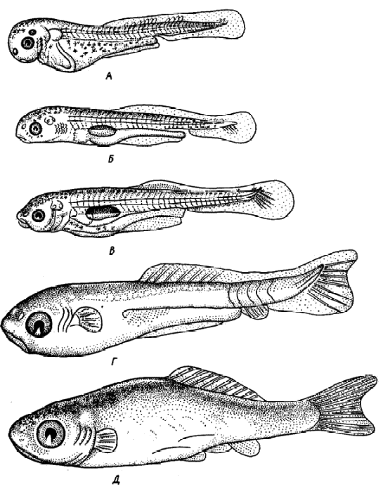 Рис. 39. Развития молоди карпа после выклева.