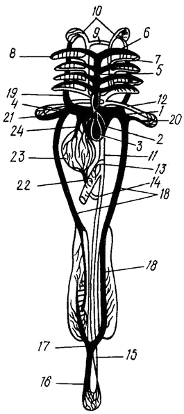 16 – хвостовая вена, 17– воротные вены почек, 18 – задняя кардинальная вена, 19 – передняя кардинальная вена, 20 – подключичная вена, 21 – Кювьеров проток, 22 – воротная вена печени,
