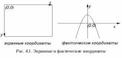 При построении на экране любого графика используются как фактические координаты графика функции в декартовой системе координат, так и экранные координаты для отображения графика на форме (рис. 4.1). Отметим, что начало координат экранной системы координат находится в левом верхнем углу, ось абсцисс направлена вправо, а ось ординат – вниз.