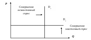 Кривая совершенно неэластичного (D1) представляет собой линию, параллельную вертикальной оси; кривая совершенно эластичного спроса (D2) параллельна горизонтальной линии.