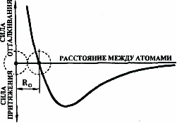 При дальнейшем падении температуры атомы сближаются еще больше - вещество переходит в жидкое состояние, силы взаимного притяжения между атомами становятся еще больше. Наконец, при уменьшении температуры ниже определенного уровня энергия броуновского движения становится незначительной, и атомы под действием сил притяжения сближаются до расстояния R0, когда «соприкасаются» внешние электронные оболочки их атомов и когда силы притяжения и отталкивания уравновешиваются - вещество переходит в твердое состояние. Дальнейшее сближение или удаление атомов друг от друга требует затраты энергии.