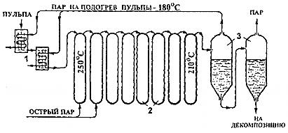Автоклав работает в непрерывном режиме. Подводимый снизу пар подогревает пульпу и перемешивает ее.