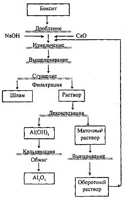 Основным рудным сырьем для производства алюминия являются бокситы. В качестве примера на рис. 5.45 приведена технологическая схема производства алюминия из бокситов (указаны операции, которые входят в каждую стадию технологической схемы).