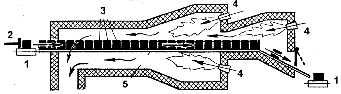 1- рольганг; 2 - толкатель; 3 - нагреваемые заготовки; 4 - горелки;