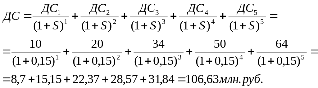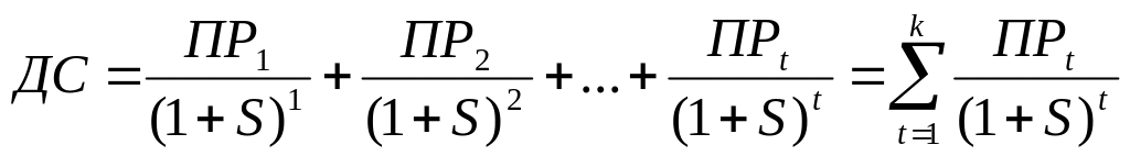 Товаропроизводитель оплачивает потребные для его производства товары (машины, оборудование и прочие орудия труда) сразу по установленной цене. Отдача же от использования этих орудий труда создается в течение ряда лет. Метод дисконтирования позволяет оценить будущий суммарный доход (прибыль, экономия) с начала осуществления инвестиций. Так, дисконтированная стоимость (ДС) любого дохода (ПР) через промежуток времени (Т) при процентной ставке (S) будет равна: