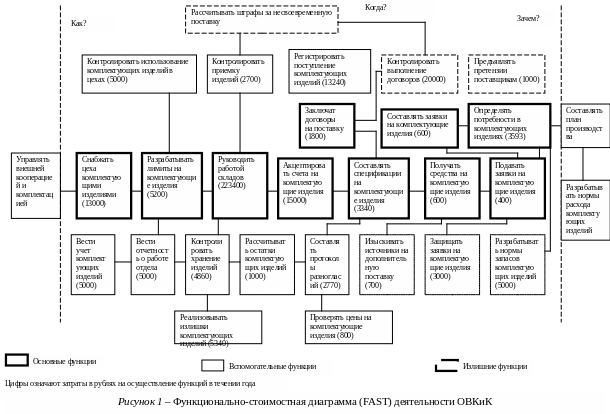 При помощи тестовых вопросов «Как?», «Зачем?», «Когда?» отсеиваются излишние или несвойственные функции. Функции, не отвечающие ни на один из этих вопросов должны быть изъяты из состава функций отдела, т.к. относятся к категории излишних или несвойственных. Все основные функции должны отвечать (по направлению слева направо) на вопрос «Как?» по отношению к главной, а по направлению справа налево – на вопрос «Зачем?». Все вспомогательные функции должны отвечать на вопрос «Когда?» по отношению к одной из основных функций (когда возможно осуществление основной функции?). В случае необходимости количество тестовых вопросов можно увеличить. Диаграмма FAST осуществления функций ОВКиК приведена на рисунке 1.