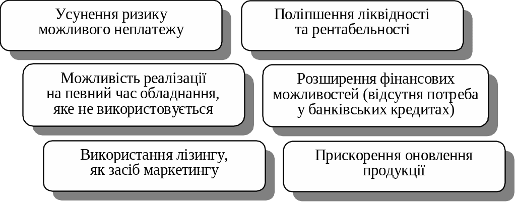 Лізинг дає змогу експортерові негайно і в повному обсязі отримати платіж, оскільки обладнання продається лізингодавцеві і експортер звільняється від усіх фінансових проблем, пов’язаних з цим товаром, за винятком зобов’язань за гарантійними строками. Позитивні моменти використання лізингу для експортера показані на рис. 3.3.
