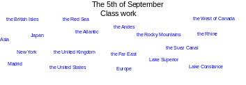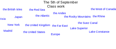 На интерактивной доске даны слова – географические названия (the West of Canada, the British Isles, the Red Sea, the Andes, the Atlantic, the Rhine, the Rocky Mountains, Japan, Asia, the Suez Canal, New York, the United Kingdom, the Far East, Lake Superior, Madrid, Lake Constance, the United States, Europe).