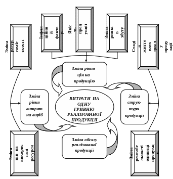 Організація економічного аналізу витрат передбачає забезпечення виконання завдань через посилення дії факторів, які позитивно впливають на показники і усунення факторів, що негативно впливають на них, для чого їх необхідно попередньо класифікувати. Скористаємося структурно-логічною схемою, щоб краще зрозуміти які чинники впливають на зміну показника витрат на одну гривню вартості продукції (рис.7.2).