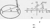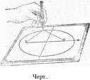 Построение эллипса по фокусам и большой оси. В чертежную доску втыкаются в фокусах эллипса две кнопки, к этим кнопкам прикрепляются концы нитки. Тогда, если оттянуть ее кончиком карандаша и передвигать карандаш, держа все время нитку натянутой, то получится эллипс с данными фокусами, длина большой оси которого равна длине нитки. Конечно, если длина нитки равна расстоянию между фокусами (а не больше его, как мы неявно предполагали), то кончик карандаша опишет только отрезок между фокусами.