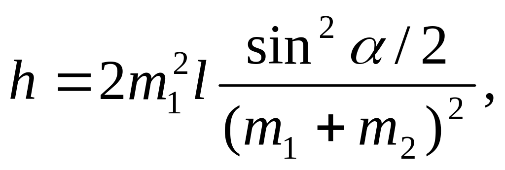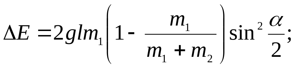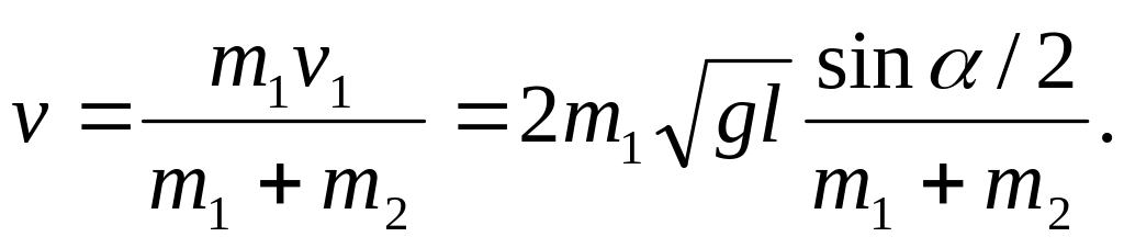 Здесь v1 и v2 – скорости шаров до удара. Скорость большего шара до удара равна нулю (v2 = 0). Скорость меньшего шара найдем, используя закон сохранения энергии. При отклонении меньшего шара на угол ему сообщили потенциальную энергию, которая затем переходит в кинетическую