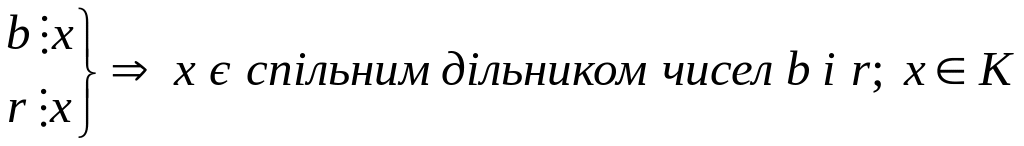 Теорема: якщо натуральне число а можна представити у вигляді a=bq+r, де a,b,q,rєN, то множина спільних дільників чисел a і b співпадає з множиною спільних дільників чисел b і r.
