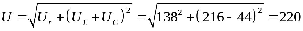 на резистивному опорі Ur= rІ= 13,8 · 10 = 138 В,