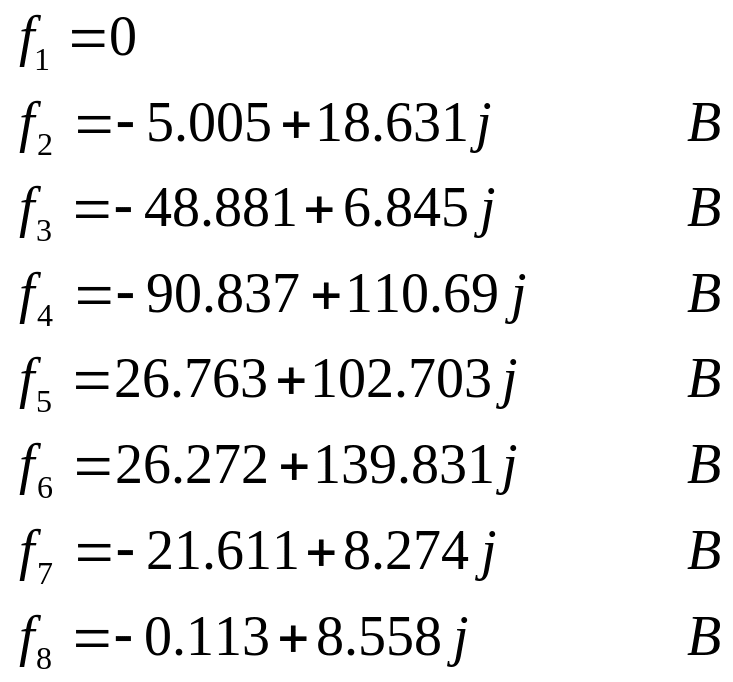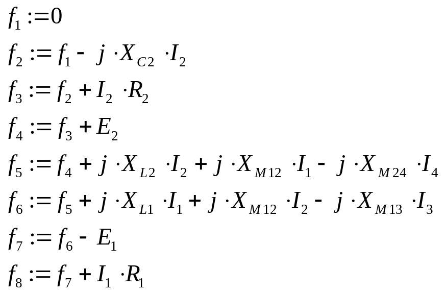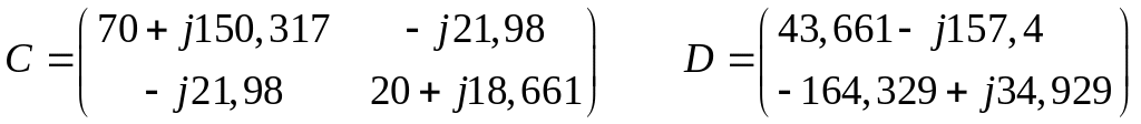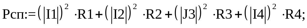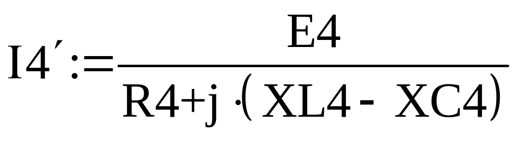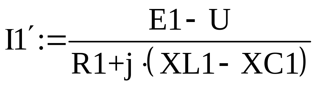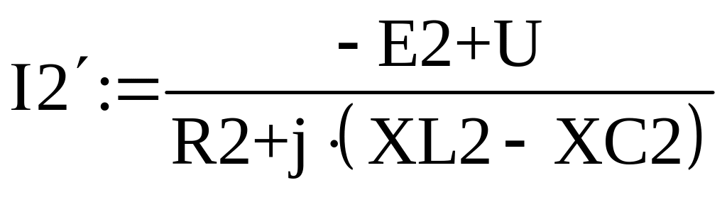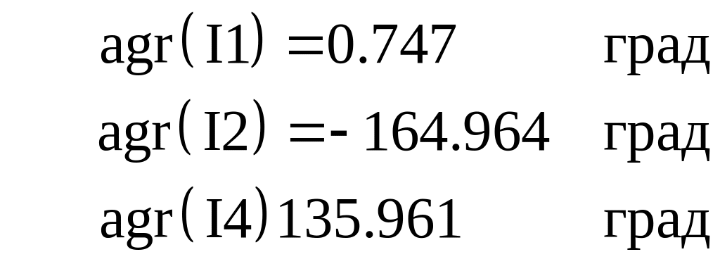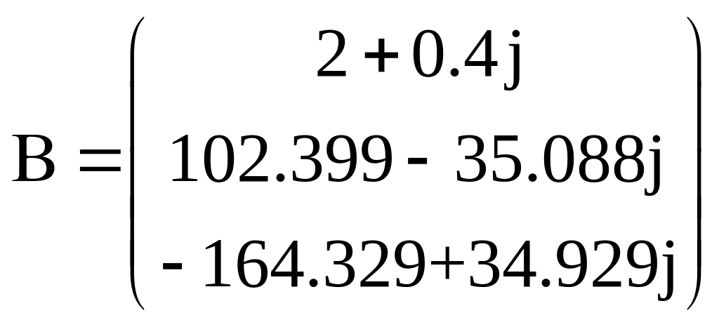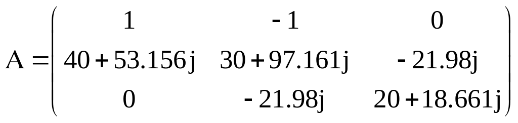 Підставляючи числові значення, отримуємо матрицю для розрахунку значень комплексних струмів за допомогою ПК. Виконаємо розрахунок як системи рівнянь, складеної за законами Кірхгофа, так і системи рівнянь, складеної за методом контурних струмів. Розрахунок виконаний на ПК за допомогою програми MathCAD 2001 Professional. Розрахунок системи рівнянь, складеної за законами Кірхгофа: Представимо систему рівнянь у такому вигляді: