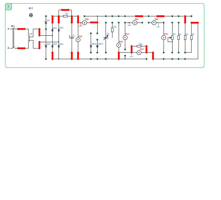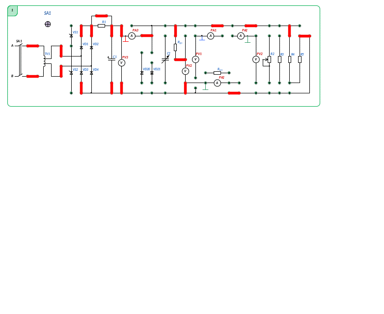 3.1.1 Собрать схему, представленную на рисунке 1. В качестве прибора с расширяемым пределом измерения будет использован вольтметр PV2 включенный на диапазоне измерения UPV2=25 B с добавочным сопротивлением RД1. В качестве контрольного прибора измеряющего напряжение на участке цепи UPV3 будет использован цифровой прибор PV3