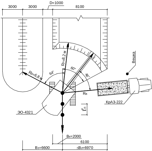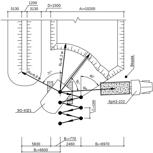 На рис. 15.3 вместо В2 можно принимать расстояние В1, однако при этом увеличивается угол поворота стрелы экскаватора в плане, что существенно снижает его производительность.
