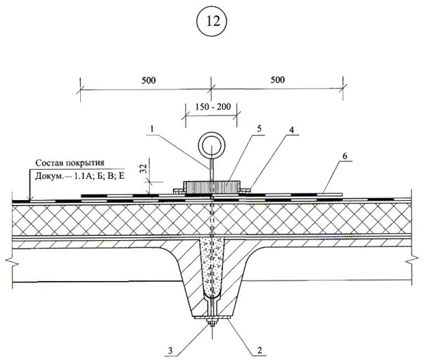 1 - анкер 2 - шайба стальная 100 ×100 ×5 мм; 3 - гайка с шайбой; 4 - рамка из уголка; 5 - герметизирующая мастика; 6 - дополнительные слои ковра.