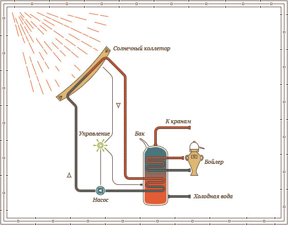 Типичный солнечный коллектор накапливает солнечную энергию в установленных на крыше здания модулях трубок и металлических пластин, окрашенных в черный цвет для максимального поглощения радиации. Они заключены в стеклянный или пластмассовый корпус и наклонены к югу, чтобы улавливать максимум солнечного света. Таким образом, коллектор представляет собой миниатюрную теплицу, накапливающую тепло под стеклянной панелью. Поскольку солнечная радиация распределена по поверхности, коллектор должен иметь большую площадь.