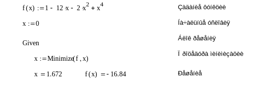 3.3. Найти точку минимума функции, используя встроенную процедуру Minimize. Mathcad – программа составляется следующим образом: