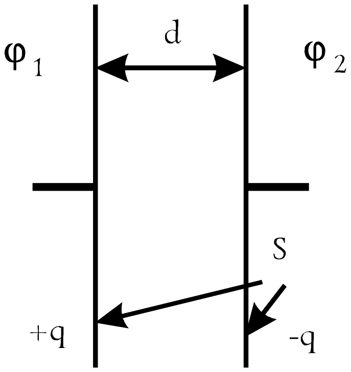 где j1 и j2 — потенциалы обкладок конденсатора, d — расстояние между ними, а Е — величина напряжённости электрического поля внутри конденсатора. Поскольку Е однозначно определяется поверхностной плотностью заряда на внутренних сторонах обкладок,