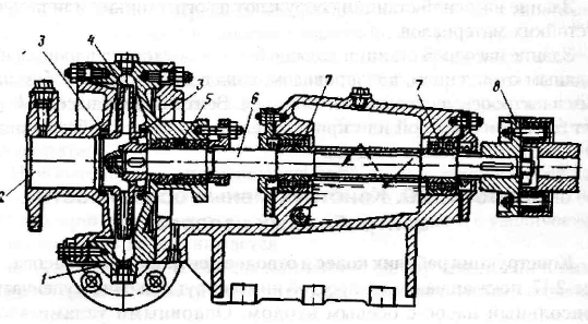 опоры вала 7. Вал насоса соединяется с приводящим двигателем с помощью муфты 5. Жидкость поступает в подвод насоса и перемещается рабочим колесом в отвод, который соединен с нагнетательным трубопроводом.