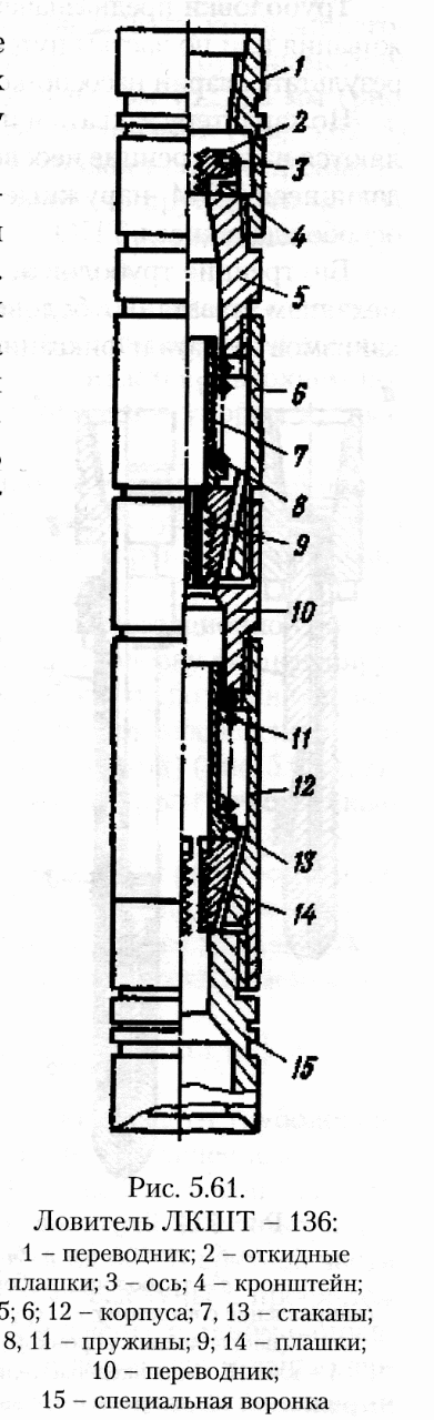 Шарнирная удочка УШ1-168 (рис. 5.71,3) представляет собой цельнокованый стержень 3 круглого сечения, на верхнем утолщенном конце которого нарезана резьба для ввинчивания в переводник 1. На верхнем конце этого переводника нарезана замковая резьба бурильных труб для присоединения удочки к колонне бурильных труб, а на нижний его конец навинчена воронка 2.