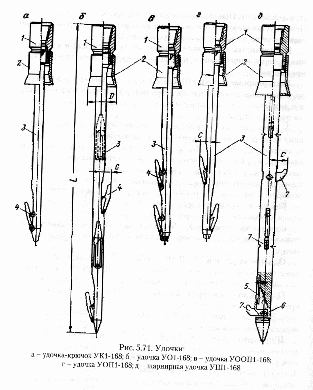 Нешарнирные удочки У01-168, УК1-168, УООШ-168 и УОП1-168 предназначены для ловли и извлечения из скважин тартальных канатов диаметром 19 мм и менее, а также каротажных кабелей диаметрами не более 22 мм.