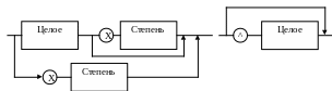Следующий нетерминал – «Слагаемое». Однако диаграмма, показанная на рис. 2, не разделяется на типовые фрагменты, что затрудняет программирование распознавателя. Неструктурированность обусловлена фрагментом, который помечен на рисунке знаком «?». Преобразуем диаграмму в эквивалентную, но состоящую только из совокупности типовых структур (рис.5). Для этого изобразим отдельно две ветви: одна соответствует слагаемому, начинающемуся с числа, другая – с буквы x. Фрагмент, выделенный на исходной диаграмме пунктирной рамкой, преобразуем в нетерминал «Степень».