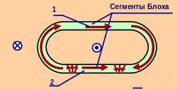 Полосовой домен с более сложной структурой содержит два участка (1 и 2), где векторы M параллельны границе, но противоположно направлены (сегменты Блоха) (Рис. 15).