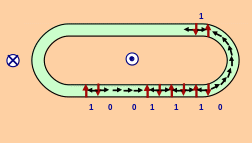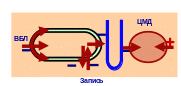 Операция считывания. На пару проводников подается импульс тока, и концы страйпов сближают. Происходит репликация (отделение) ЦМД, который каналируется в регистр вывода информации и затем детектируется. На конце страйпа сохраняется отрицательная ВБЛ.