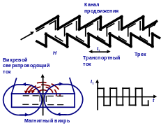 Принципы организации ЗУ на магнитных вихрях аналогичны ЗУ на ЦМД. Генератор магнитных вихрей (флуксонов) формирует вихри, находящиеся в состоянии безразличного равновесия. Устройство управления представляет собой схему продвижения вихрей по каналу, осуществляемую силой Лоренца, создаваемую транспортным током (рис. 29). Однонаправленность движения вихрей обеспечивается ассиметрией канала продвижения. Считывание магнитных вихрей может осуществляться с использованием квантовых интерферометров, а также одиночных джозефсоновских контактов.