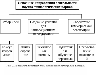 В соответствии с постановлением Совета Министров Республики Беларусь «Положение о научно-технологическом парке» [1.8], под технопарком понимается «субъект инновационной инфраструктуры, способствующий развитию предпринимательства в научно-технической сфере путем создания благоприятных условий, включающих материально-техническую и информационную базу». Технопарк обеспечивает условия для осуществления инновационного процесса – от поиска (разработки) новшества до выпуска образца товарного продукта и его реализации (рисунок 8).