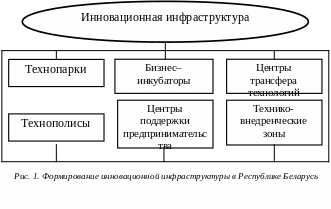 В современных условиях одной из задач, решение которой способствовало бы активизации деятельности субъектов инновационного предпринимательства, является упрощение и прозрачность процедуры регистрации предприятий и лицензирования видов деятельности. В республике ведется работа по формированию инновационной инфраструктуры (рисунок 7), что позволяет комплексно решать вопросы организации информационно-консультативных услуг и технической помощи инновационным предприятиям.