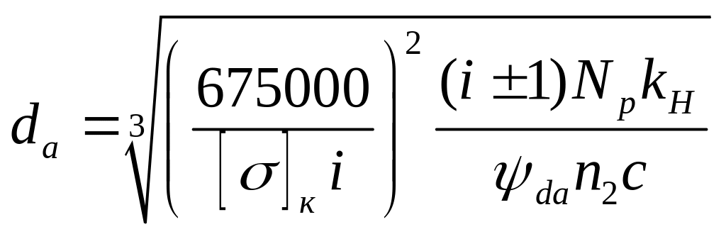 где Nр – расчётная мощность на валу da; i – передаточное число, определяемое как отношение большего числа зубьев рассчитываемой пары к меньшему; da – диаметр меньшего колеса из пары, n2 – число оборотов большего из пары; ψda – коэффициент ширины зуба по диаметру (0,6 ÷ 0,75); c – число сателлитов; kH – коэффициент неравномерности распределения нагрузки по ширине зуба (1,5 ÷ 1,6).