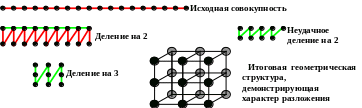 Чем больше сомножителей, тем многослойней структура, демонстрирующая характер разложения. Наоборот, простое число соответствует распределению всех элементов на отрезке.