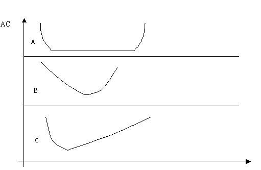 Кривая А — издержки достигают минимального уровня и на большом отрезке, характеризующем увеличение масштабов производства, остаются таковыми. Кривая Б — по мере роста масштаба производства издержки плавно и медленно