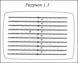 Отклоняющая система состоит из нескольких катушек индуктивности, размещенных у горловины кинескопа. С помощью переменного магнитного поля две катушки создают отклонение пучка электронов в горизонтальной плоскости, а другие две - в вертикальной. Изменение магнитного поля возникает под действием переменного тока, протекающего через катушки и изменяющегося по определенному закону (это, как правило, пилообразное изменение напряжения во времени), при этом катушки придают лучу нужное направление. Путь электронного луча на экране схематично показан на рис. 1.3. Сплошные линии - это активный ход луча, пунктир - обратный.