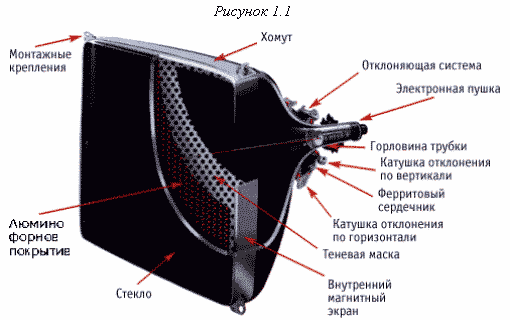 Самым важным элементом монитора является кинескоп, называемый также электронно- лучевой трубкой (основные конструкционные узлы кинескопа показаны на рис 1.1). Кинескоп состоит из герметичной стеклянной трубки, внутри которой находится вакуум, то есть весь воздух удален. Один из концов трубки узкий и длинный - это горловина, а другой - широкий и достаточно плоский - это экран. С фронтальной стороны внутренняя часть стекла трубки покрыта люминофором (luminophor). В качестве люминофоров для цветных ЭЛТ используются довольно сложные составы на основе редкоземельных металлов - иттрия, эрбия и т.п. Люминофор - это вещество, которое испускает свет при бомбардировке его заряженными частицами. Заметим, что иногда люминофор называют фосфором, но это не верно, т.к. люминофор, используемый в покрытии ЭЛТ, ничего не имеет общего с фосфором. Более того, фосфор "светится" в результате взаимодействия с кислородом воздуха при окислении до P 2O 5и "свечение" происходит небольшое количество времени (кстати, белый фосфор - сильный яд).