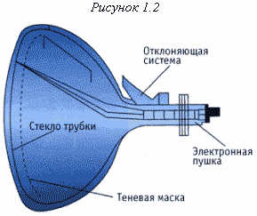 Для создания изображения в ЭЛТ-мониторе используется электронная пушка, откуда под действием сильного электростатического поля исходит поток электронов. Сквозь металлическую маску или решетку они попадают на внутреннюю поверхность стеклянного экрана монитора, которая покрыта разноцветными люминофорными точками. Поток электронов (луч) может отклоняться в вертикальной и горизонтальной плоскости, что обеспечивает последовательное попадание его на все поле экрана. Отклонение луча происходит посредством отклоняющей системы [см. рис 1.2]. Отклоняющие системы подразделяются на седловидно-тороидальные и седловидные. Последние предпочтительнее, поскольку создают пониженный уровень излучения.