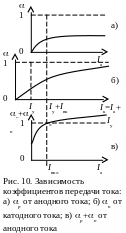 Следствием этого является увеличение коэффициента передачи αn и транзитной составляющей электронного тока Inαn. Условие лавинообразного нарастания тока через тринистор (αp + αn ) → 1 (см. формулу 8) выполняется при меньшем токе анода Iа.