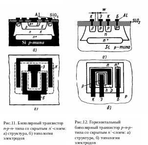 Основу биполярных интегральных микросхем составляют транзисторы n-p-n-типа, которые имеют лучшие характеристики и проще в изготовлении по сравнению с транзисторами p-n-p-типа. Дело в том, что для формирования сильнолегированных эмиттерных областей транзисторов n-p-n-типа обычно используют диффузию фосфора, который имеет большую растворимость в кремнии и относительно малый коэффициент диффузии. Таким образом, для формирования p-n-p-транзистора необходимо провести еще одну дополнительную диффузию акцептора с предельной растворимостью, превышающей предельную растворимость фосфора, а такие акцепторы практически отсутствуют.