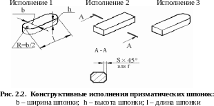 Соединения призматическими шпонками используются в конструкциях чаще, чем другие: эти шпонки имеют небольшую глубину врезания в вал, а следовательно, ослабляют его в наименьшей степени, и при этом монтаж и демонтаж врезных шпонок относительно прост. Передача вращающего момента осуществляется за счет нормальных давлений, действующих на поверхности шпонки вследствие вращения. Рабочие – узкие грани шпонки. Соединение деталей шпонкой осуществляется свободным (вал/втулка H9/D10), нормальным (вал/втулка N9/JS9) и плотным (вал/втулка P9/P9). Призматические шпонки изготавливают из чистотянутой стали прямоугольного сечения с отношением высоты к ширине 1:1 (для валов малого диаметра) и 1:2 (для валов большого диаметра). Допускается применять сталь с временным сопротивлением разрыву не менее 590 МПа. ГОСТами предусматривается три исполнения призматических шпонок: исполнение 1 - со скругленными торцами, исполнение 2 – с обоими плоскими торцами, исполнение 3 – с одним закругленным и одним плоским торцем, (для призматических высоких шпонок предусмотрены два исполнения – 1 и 2) (рис. 2.2.).