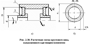 Расчетная схема кругового шва, нагруженного крутящим моментом, приведена на рис. 2.30 а.