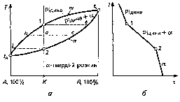 Рисунок 4 - Діаграма стану (а) та крива охолодження (б) сплавів з необмеженою розчинністю компонентів у рідкому і твердому станах