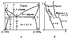 Рисунок 5 - Діаграма стану сплавів з обмеженою розчинністю компонентів у твердому стані (а) та криві охолодження (б)