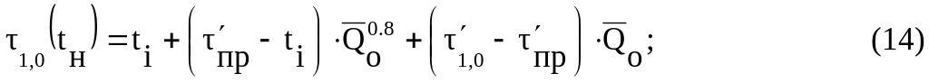 де τ1,0 (tн) – температура мережної води в подаючому трубопроводі перед елеватором або змішуючим насосом, яка залежить від температури зовнішнього повітря tн, оС; τ2,0 (tн) – температура мережної води в зворотному трубопроводі після системи опалення, яка залежить від температури зовнішнього повітря tн, оС; τ3 (tн) – температура води після елеватора або змішуючого насосу системи опалення, яка залежить від температури зовнішнього повітря tн, оС; τ/1,0 – температура мережної води в подаючому трубопроводі перед елеватором або змішуючим насосом, при розрахунковій температурі зовнішнього повітря на опалення t/о, оС; τ/2,0 температура мережної води в зворотному трубопроводі після системи опалення, при розрахунковій температурі зовнішнього повітря на опалення t/о, оС; τ/3 – температура води після елеватора або змішуючого насосу системи опалення, при розрахунковій температурі зовнішнього повітря на опалення t/о, оС, приймається 95 -105 оС.; τ/пр - розрахункова середня температура опалювального пристрою, при розрахунковій температурі зовнішнього повітря на опалення t/о, оС;